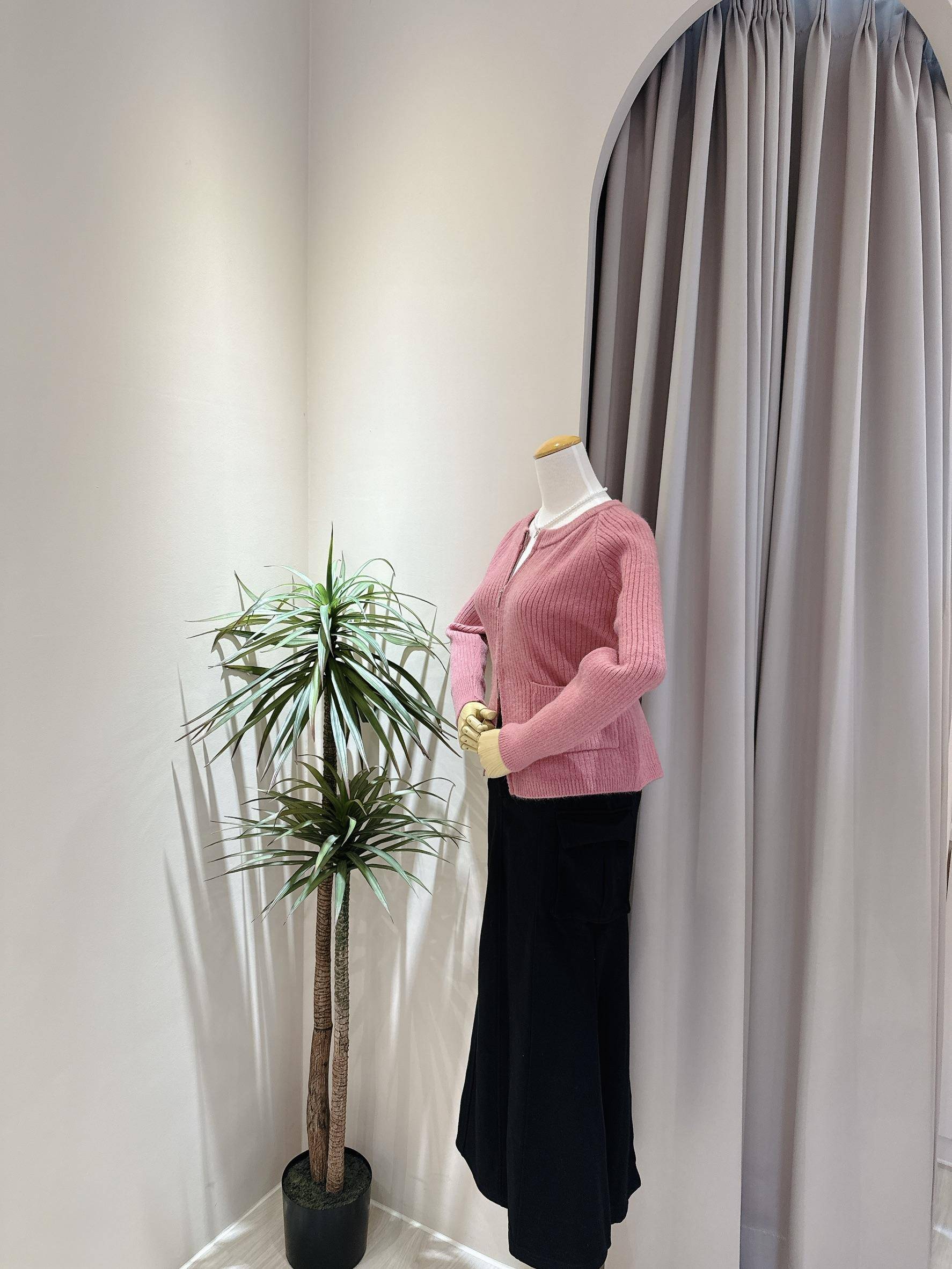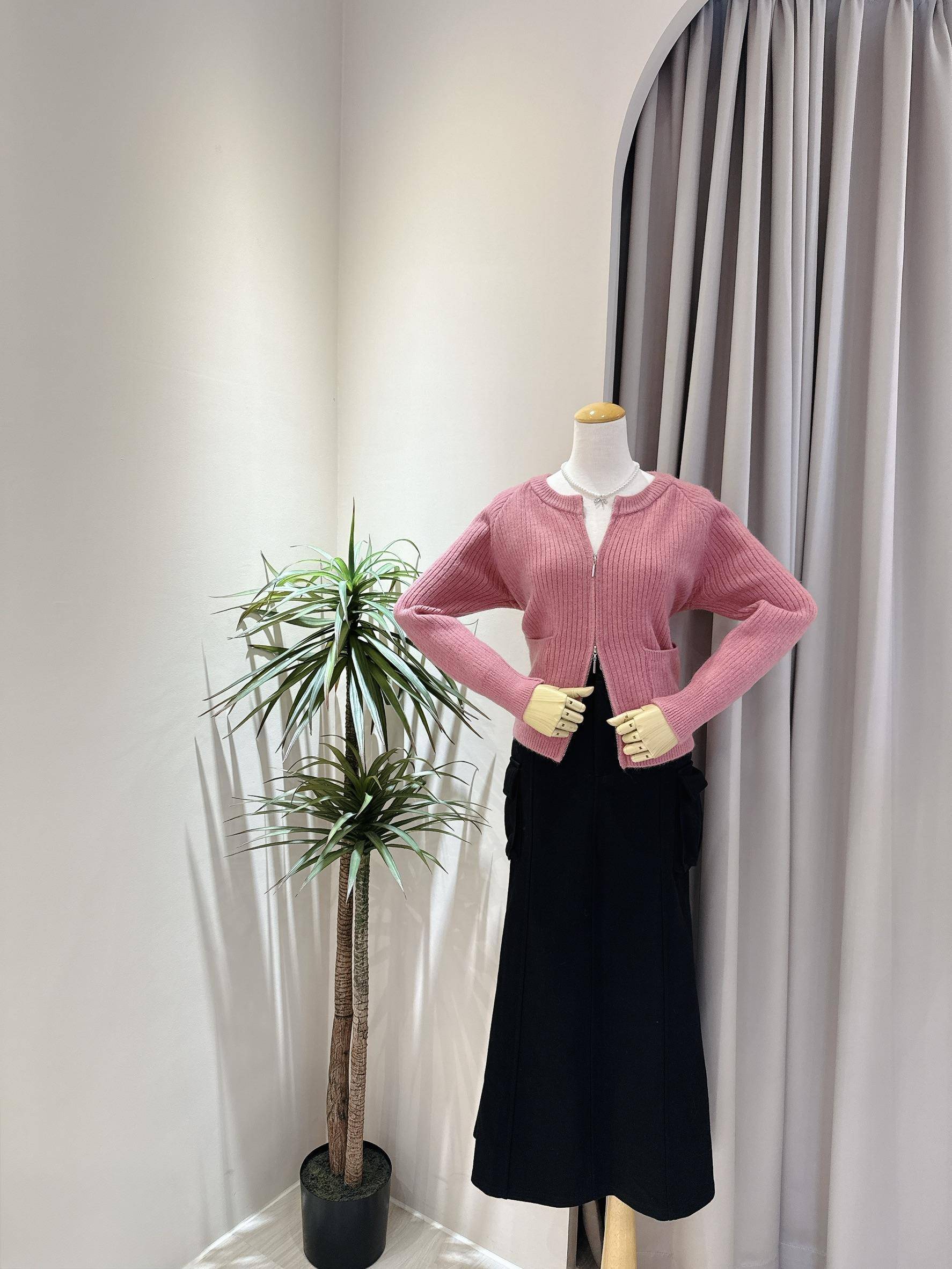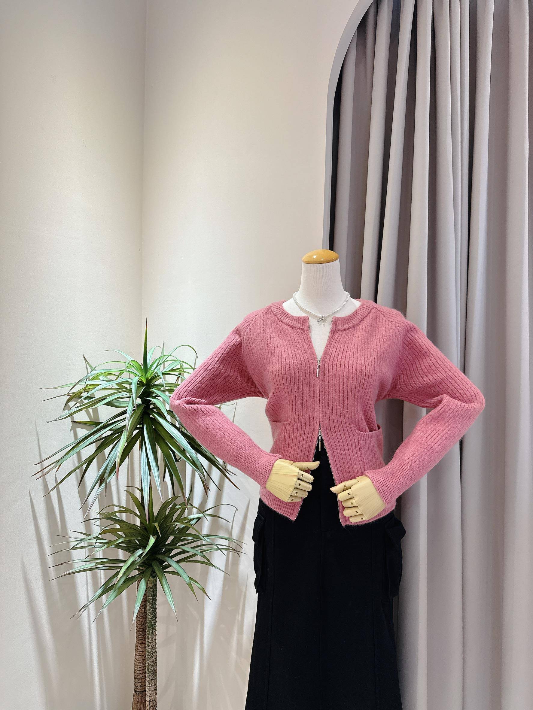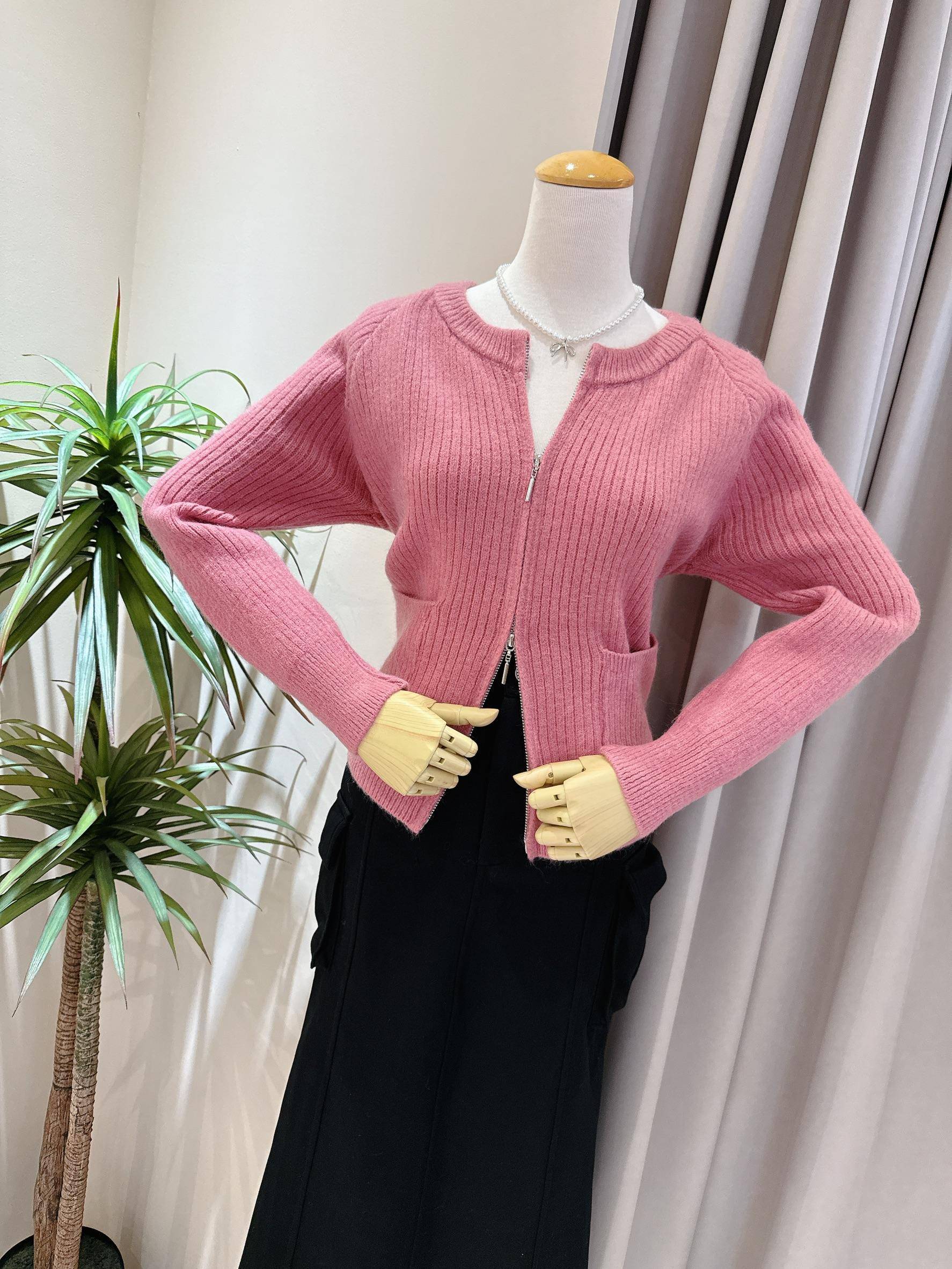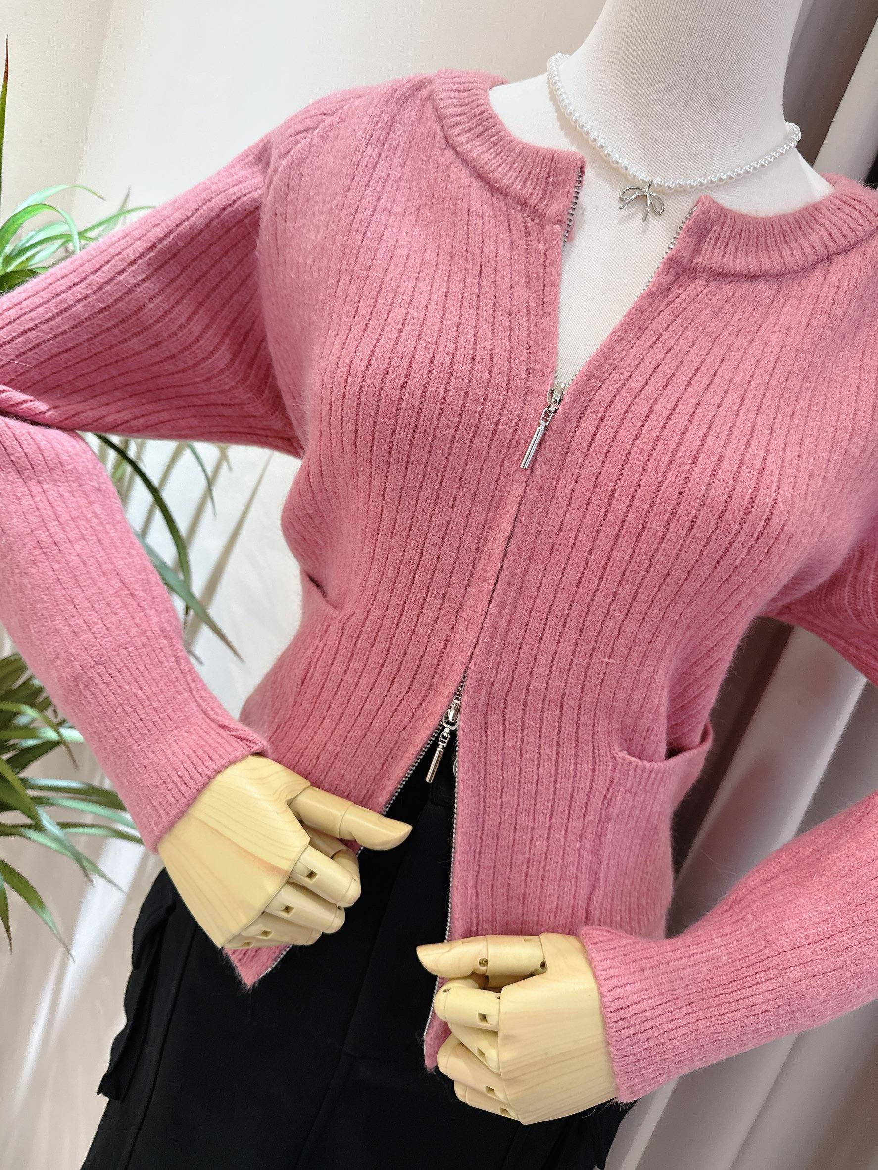 溫柔玫瑰色拉鍊雙口袋針織外套